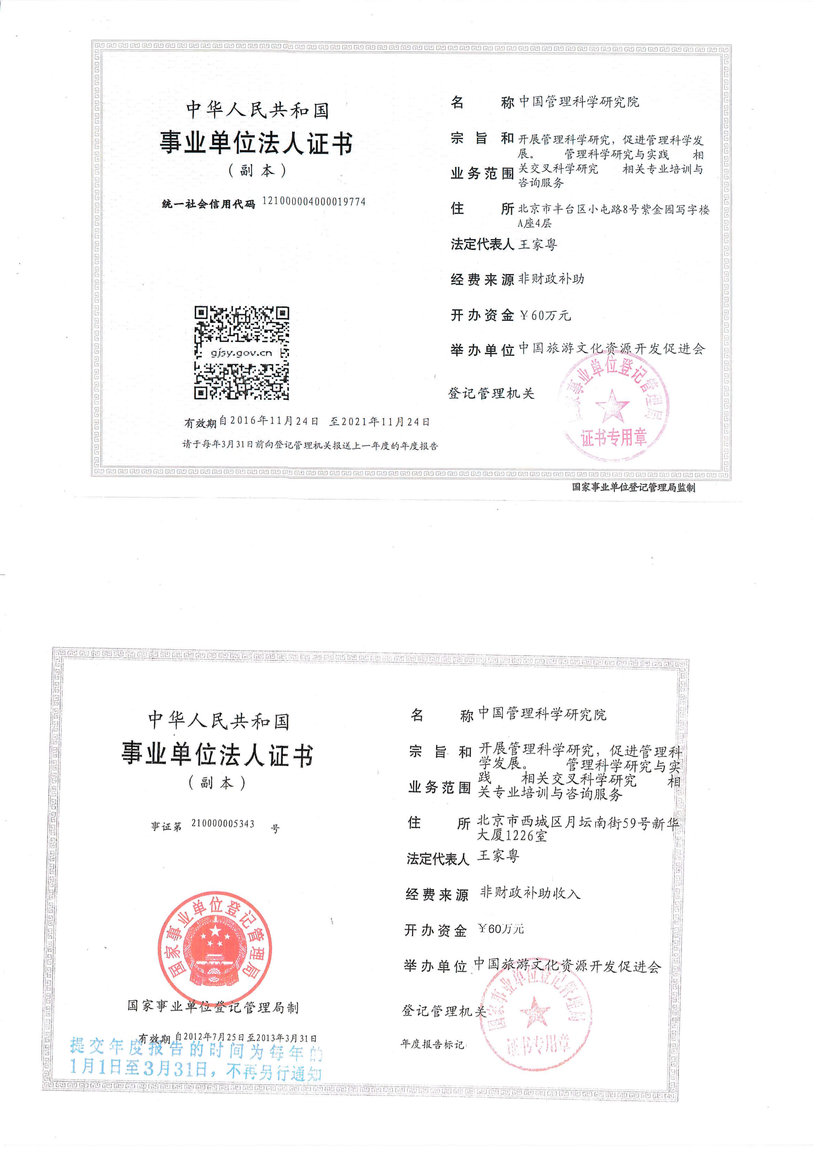 2、中管院《事业单位法人证书》(仅附2012年和2016年法人